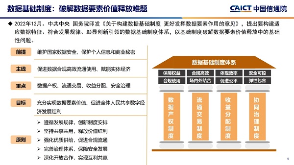 去年年底,中共中央、国务院印发《关于构建数据基础制度 更好发挥数据要素作用的意见》,也就是“数据二十条”。这是我国首部从生产要素高度部署数据要素价值释放的国家级专项政策文件,具有里程碑式的重大意义。“数据二十条”纲举而目张,首先明确了构建数据基础制度、发挥数据要素作用的前提、主线和目标,即在维护国家数据安全、保护个人信息和商业秘密的前提下,促进数据合规高效流通使用、赋能实体经济,从而充分实现数据要素价值、促进全体人民共享数字经济发展红利。进一步地,“数据二十条”具体提出了适应数据特征、符合发展规律、彰显创新引领的数据基础制度体系,具有独特的政策设计,即以基础制度破解数据要素价值释放中的基础性问题。保障权益、合规使用的数据产权制度,合规高效、场内外结合的数据要素流通和交易制度,体现效率、促进公平的数据要素收益分配制度,安全可控、弹性包容的数据要素治理制度,这四大制度构成了数据基础制度的“四梁八柱”,为进一步推动数据要素价值释放指明了方向。