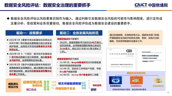 数据要素市场化发展的不断演进对数据安全底座能力的要求不断提升。数据安全风险评估作为数据安全治理能力提升的关键环节,一方面受国家各项政策驱动备受关注,另一方面随着数据泄露等事件的愈演愈烈,基于风险防范目标而开展的数据安全工作也成为业务数字化健康发展中的必选题。因此,数据安全风险评估正在成为数据安全治理的重要抓手,国家也在标准化工作、实践指南等方面做出了相应探索。此前,中国信通院也提出了基于系统管理安全、系统数据安全、系统应用安全的数据安全风险评估框架,助力企业数据安全风险防范。