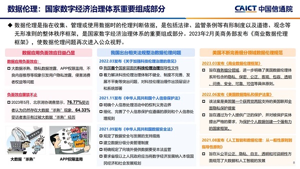 大数据、人工智能等新技术的蓬勃发展促进了科技创新和经济发展。但大数据应用的负面效益也不容忽视,如大数据杀熟、隐私数据泄露、数据滥用、不良内容推荐等现象层出不穷,人类基于传统生活世界的伦理价值也面临着巨大挑战。因此,自2021年开始,我国针对数据安全、个人信息保护、科技伦理等问题陆续出台多项法律法规旨在搭建数据伦理治理框架,持续推进科技向善发展;纵观国际社会,美国自2020年开始加速数据伦理体系的布局,目前已涵盖理论框架、实践指引、相关立法三个层面。为了更好的治理细分领域数据伦理问题,2023年2月美商务部发布的《商业数据伦理框架》是其在商务领域的补充。由此可见,建立完善的数据伦理治理体系是保障数字经济健康发展的必要条件,需要政府、企业和社会各方面的共同努力。
