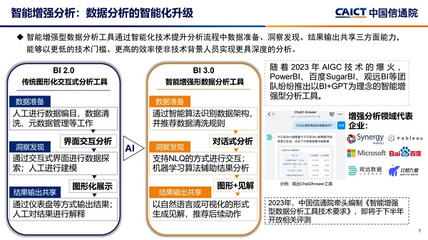 智能增强型数据分析工具是通过机器学习、自然语言处理等智能化技术提升数据分析流程中的数据准备、洞察发现、结果输出共享三方面能力,从而提升数据分析工作的自动化程度。此概念由gartner于2017年提出,但受限于当时的AI技术水平,该领域并未取得突破性的发展。随着2023年AIGC技术的火热,其在数据分析领域的应用也受到了各方关注。微软PowerBI、百度SugarBI、观远BI等团队纷纷加快智能增强型数据分析方向的探索和布局,并推出以BI+大模型为理念的智能增强型分析工具。智能增强型数据分析工具使用户能通过对话式的形式同工具进行交互;工具通过语义解析,调用相关的数据源,适配相应的分析算法和数据可视化呈现方式,并自动生成统计图表、文字见解和分析报告;智能增强型数据分析工具使得数据分析工作可以通过类似聊天的形式轻松完成,使非技术背景的用户能够以更低的门槛、更高的效率实现具有一定深度的分析,使数据能够赋能于更多一线人员,这将极大地促进数据分析工作的普惠化发展。