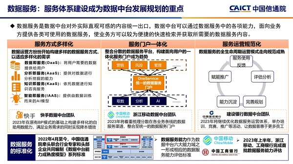2022年4月至今,信通院牵头联合行业专家和头部企业共同编制《数据中台能力成熟度模型》系列标准,数据服务能力作为数据中台六大能力域之一纳入到了该标准体系。2023年上半年,浙江移动、工商银行完成了基于该标准的首批数据服务能力评估。