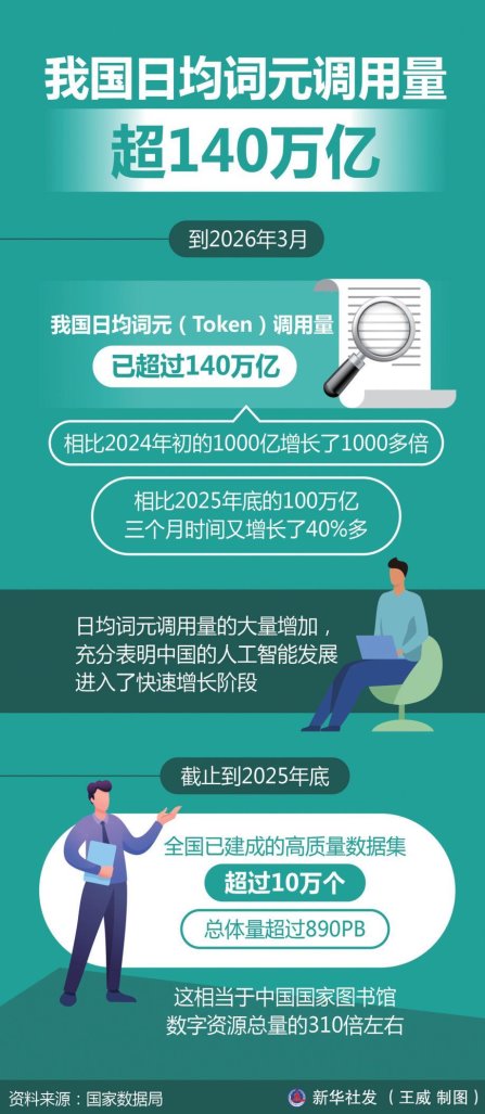 刘烈宏提到,截至2025年年底,全国已建成的高质量数据集超过了10万个,总体量超过了890PB,这相当于中国国家图书馆数字资源总量的310倍。到今年3月,我国日均Token的调用量,也就是词元的调用量,已经超过了140万亿。充分表明中国的人工智能发展进入了快速增长阶段。