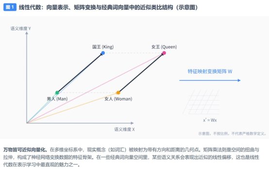 向量(Vector)与表示: 一张图片可以被拆解为一个包含千万个像素值的数组;一个词语可以被映射成一个包含几百个数字的向量(Word Embedding)。这些向量不仅代表了特征,还在经验上展现出了语义空间中的方向和相对距离(比如经典词向量中的“国王-男人+女人≈女王”)。 矩阵(Matrix)与变换: 神经网络的核心计算大量依赖矩阵乘法();而真正让模型具备强表达能力的,还包括非线性激活函数、归一化、注意力等机制。矩阵 就像是一组“滤镜”或“转换器”,把输入的数据从一个空间映射到另一个空间,提取出核心特征。 张量(Tensor): 无论是 ChatGPT 还是 Sora,它们处理的多维数据(时间序列、空间图像等)统称为张量。现今最著名的 AI 框架之一 TensorFlow,其名字的意思就是“张量在流动”。